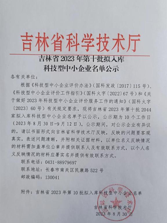 吉林省2023年第10批拟入库科技型中小企业名单公示正文.jpg PICTURE