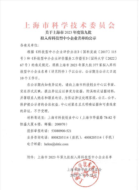 上海市2023年第9批拟入库科技型中小企业名单公示正文.jpg PICTURE