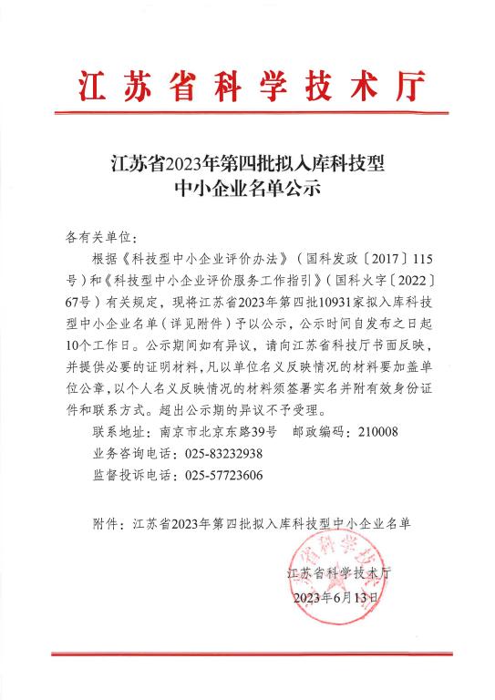 江苏省2023年第4批拟入库科技型中小企业名单公示正文.jpg PICTURE
