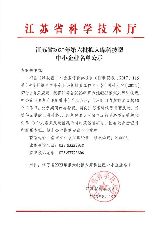 江苏省2023年第6批拟入库科技型中小企业名单公示正文.jpg PICTURE