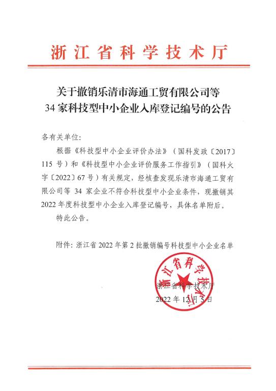 浙江省2022年第2批撤销编号科技型中小企业名单公告正文.jpg PICTURE