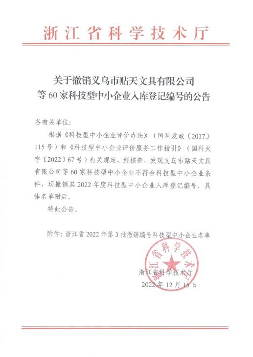 浙江省2022年第3批撤销编号科技型中小企业名单公告正文.jpg PICTURE