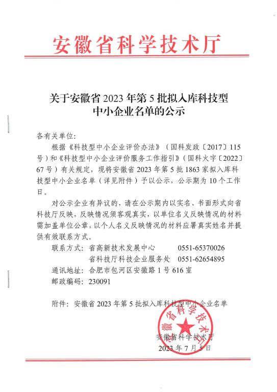 安徽省2023年第5批拟入库科技型中小企业名单公示正文.jpg PICTURE