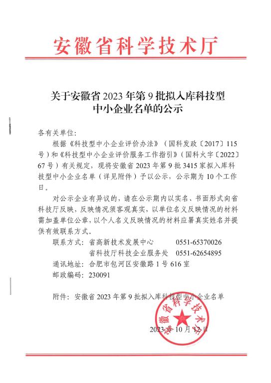安徽省2023年第9批拟入库科技型中小企业名单公示正文.jpg PICTURE