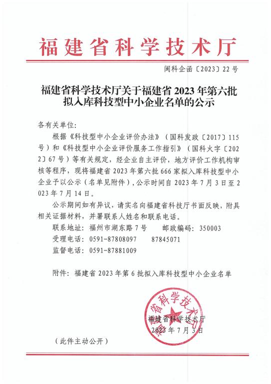 福建省2023年第6批拟入库科技型中小企业名单公示正文.jpg PICTURE