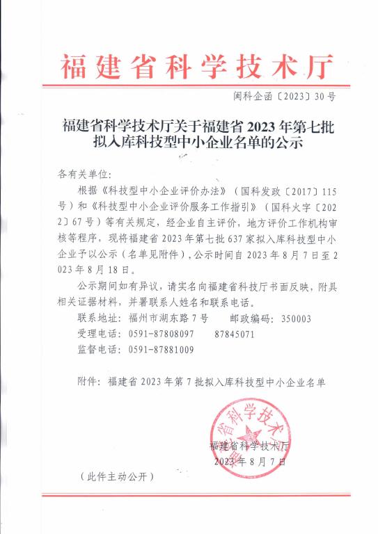 福建省2023年第7批拟入库科技型中小企业名单公示正文.jpg PICTURE