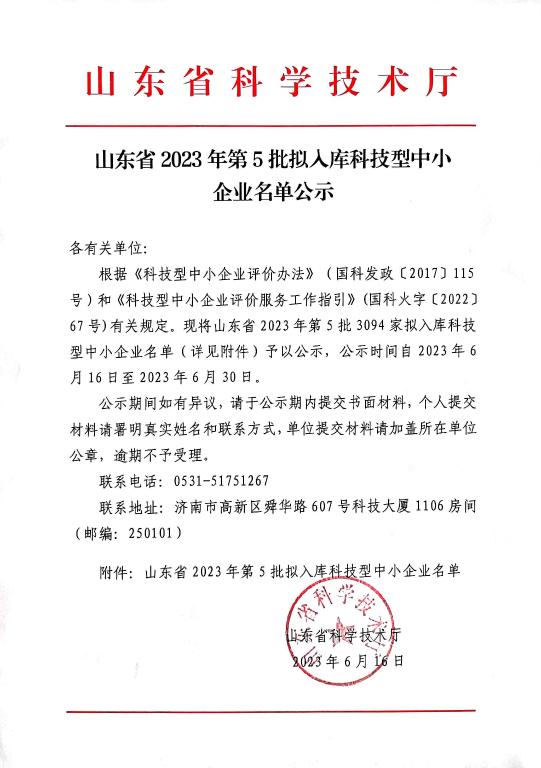 山东省2023年第5批拟入库科技型中小企业名单公示正文.jpg PICTURE