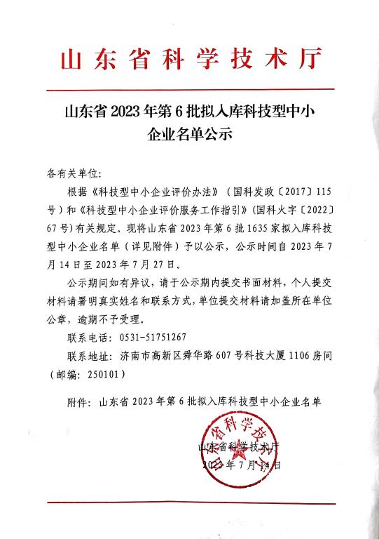 关于公示山东省2023年第六批拟入库科技型中小企业名单的通知.jpg PICTURE