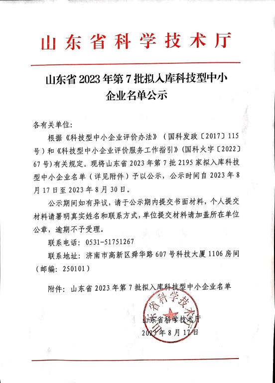 山东省2023年第7批拟入库科技型中小企业名单公示正文.jpg PICTURE