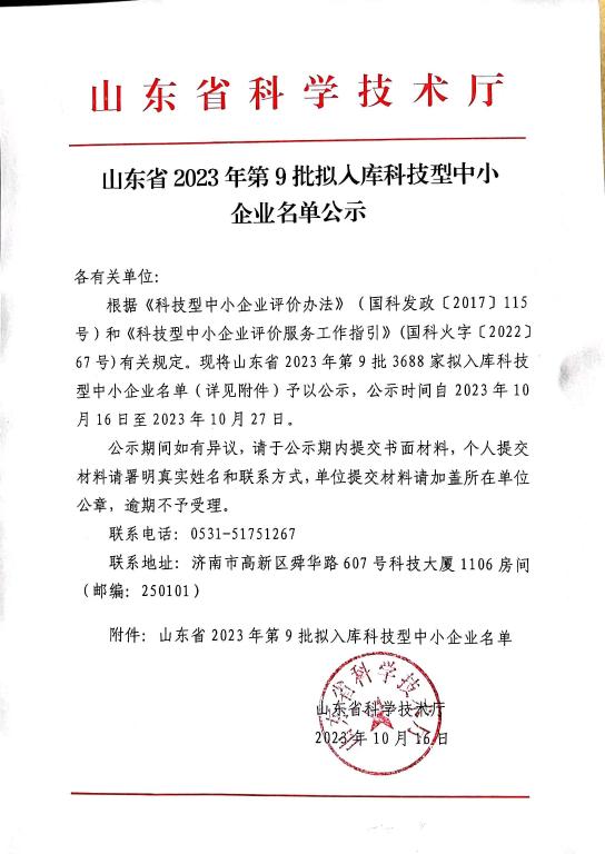 山东省2023年第9批拟入库科技型中小企业名单公示正文.jpg PICTURE