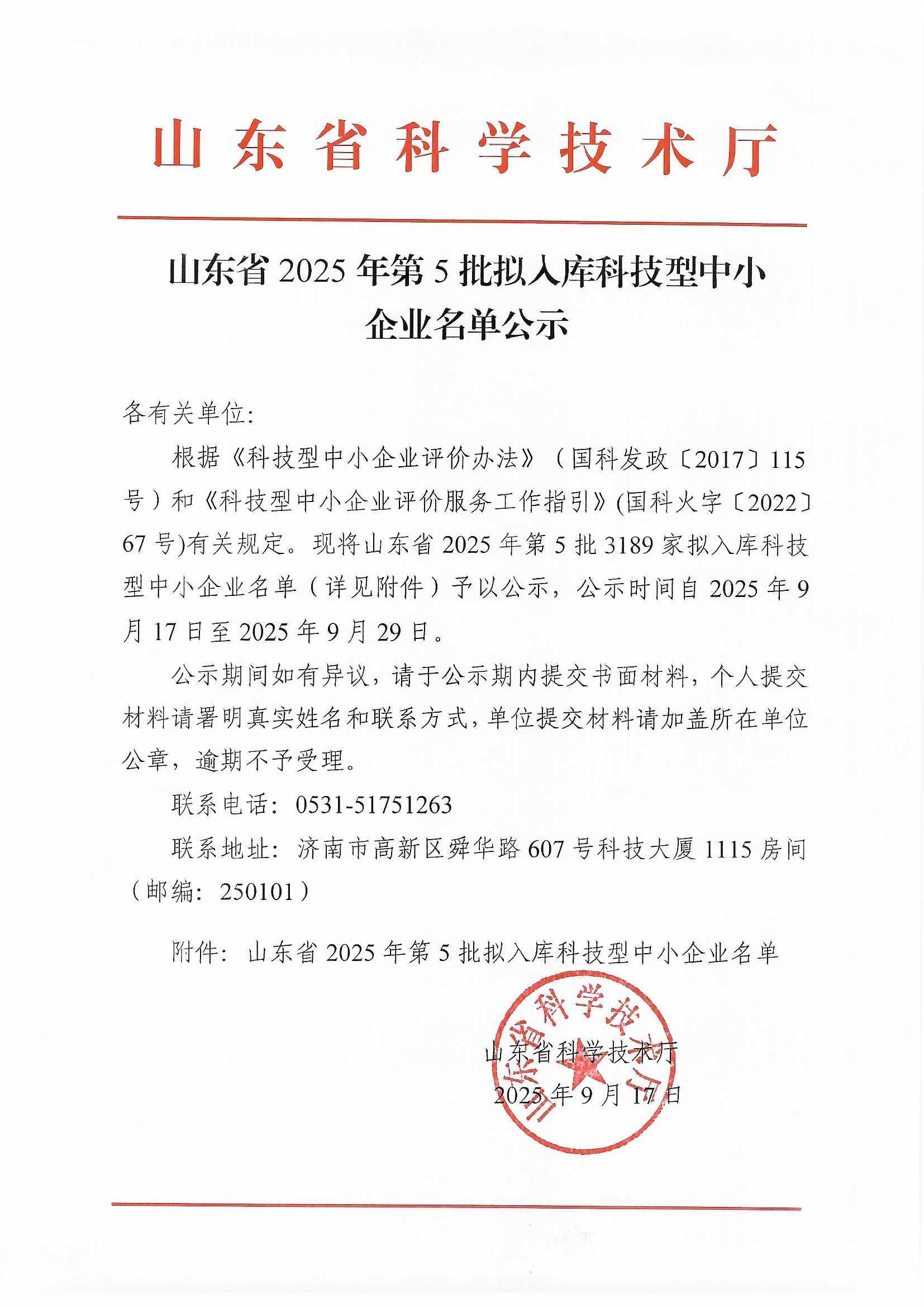 山东省2025年第5批拟入库科技型中小企业名单公示正文.jpg PICTURE
