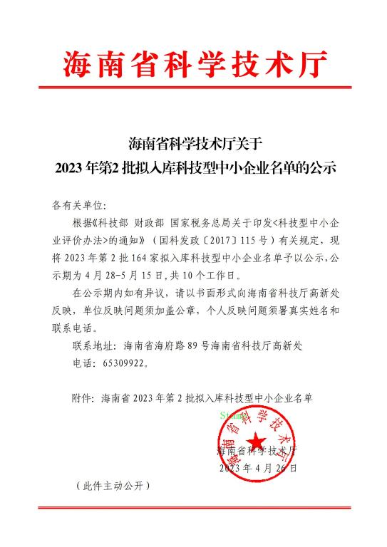 海南省2023年第2批拟入库科技型中小企业名单公示正文.jpg PICTURE