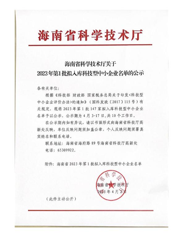 海南省2023年第1批拟入库科技型中小企业名单公示正文.jpg PICTURE