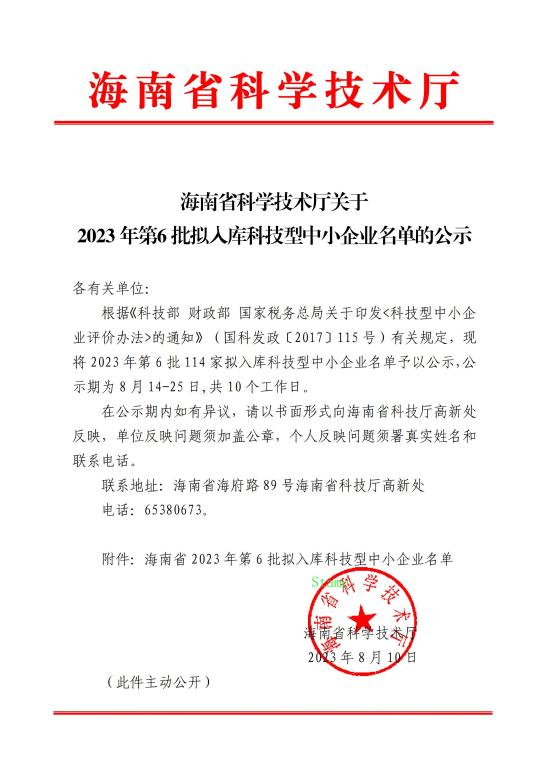 海南省2023年第6批拟入库科技型中小企业名单公示正文.jpg PICTURE