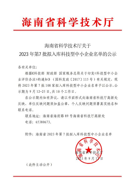 海南省2023年第7批拟入库科技型中小企业名单公示正文.jpg PICTURE
