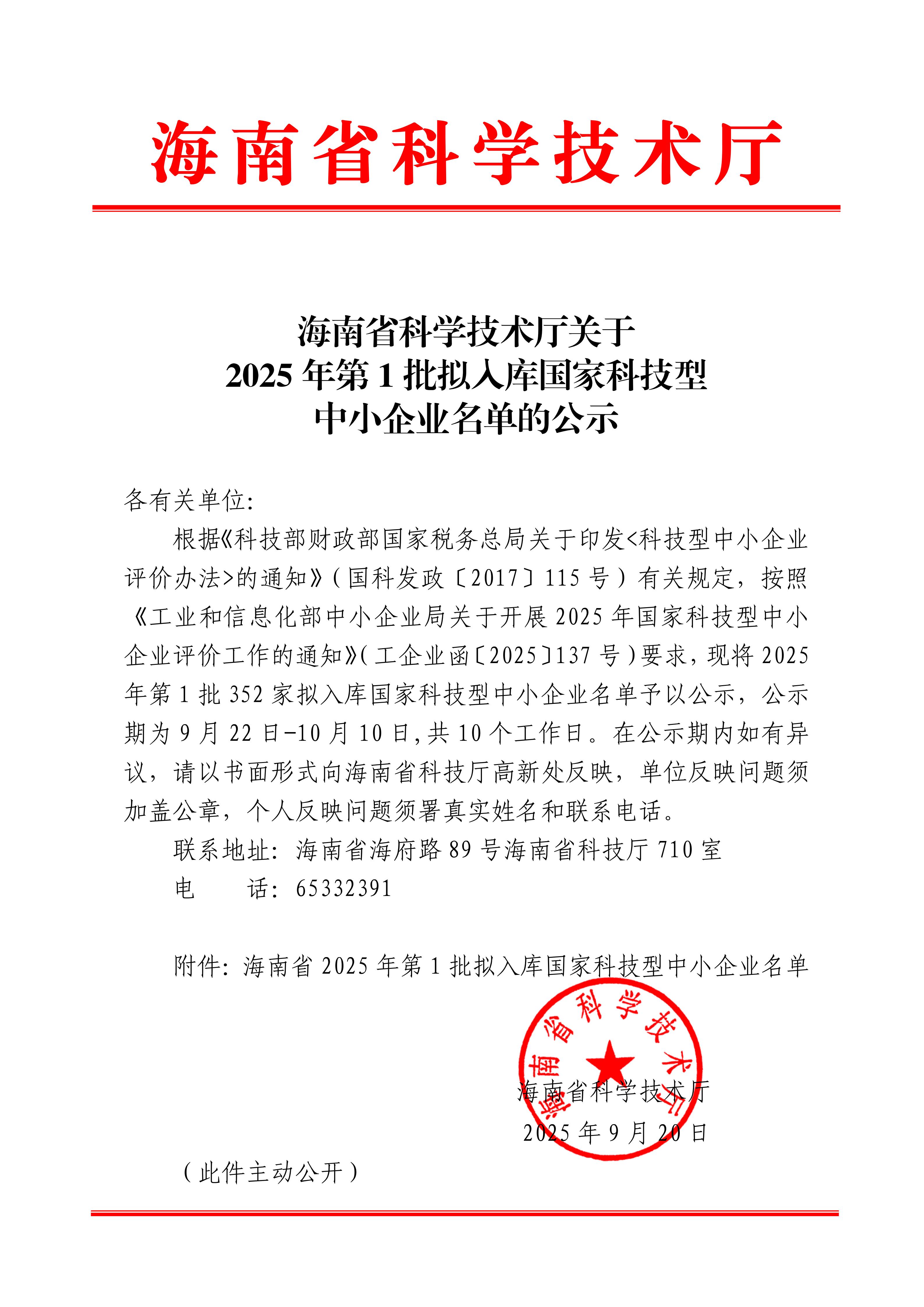 海南省2025年第1批拟入库科技型中小企业名单公示正文.jpg PICTURE