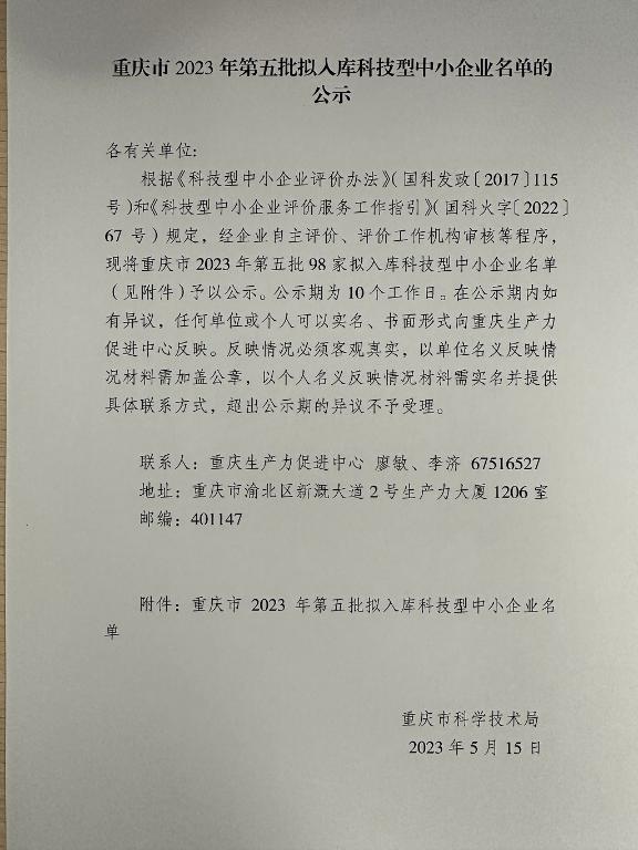 重庆市2023年第5批拟入库科技型中小企业名单公示正文.jpg PICTURE
