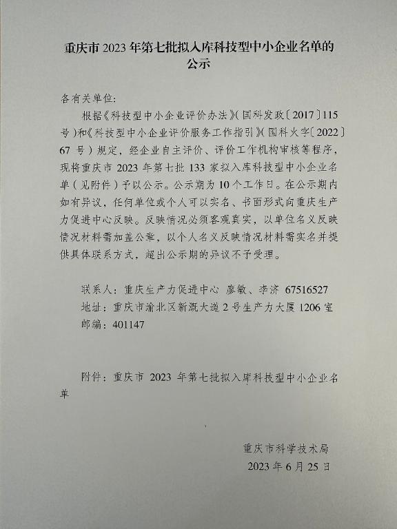 重庆市2023年第7批拟入库科技型中小企业名单公示正文.jpg PICTURE