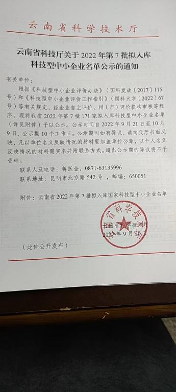 云南省2022年第7批拟入库科技型中小企业名单公示正文.jpg PICTURE