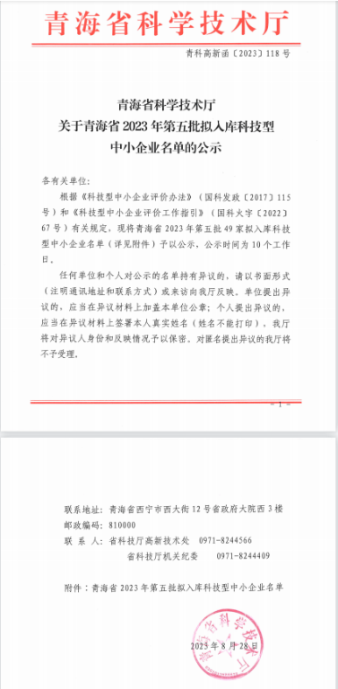 青海省2023年第5批拟入库科技型中小企业名单公示正文.jpg PICTURE