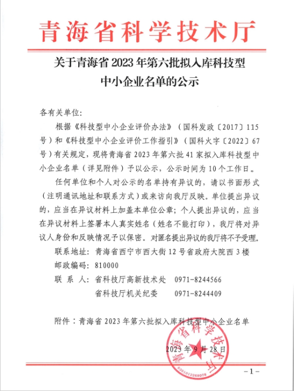 青海省2023年第6批拟入库科技型中小企业名单公示正文.jpg PICTURE