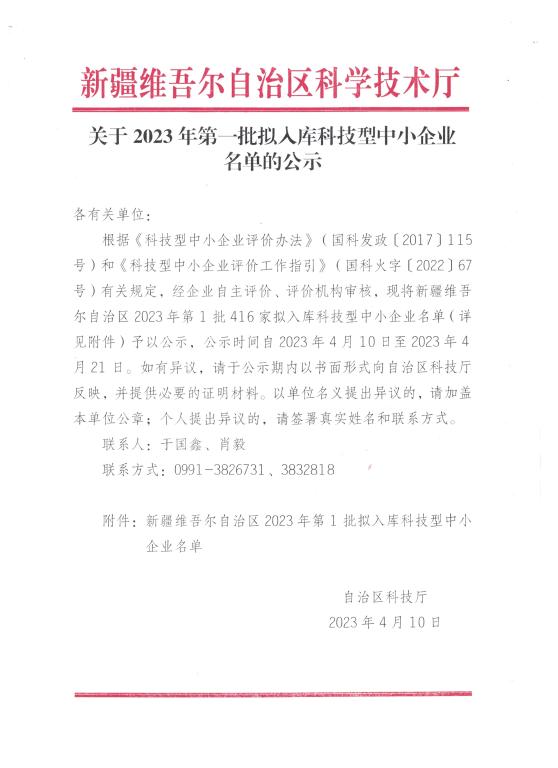 新疆维吾尔自治区2023年第1批拟入库科技型中小企业名单公示正文.jpg PICTURE