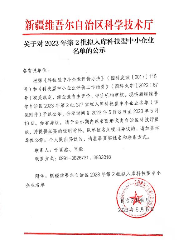 新疆维吾尔自治区2023年第2批拟入库科技型中小企业名单公示正文.jpg PICTURE