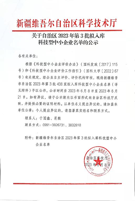新疆维吾尔自治区2023年第3批拟入库科技型中小企业名单公示正文.jpg PICTURE