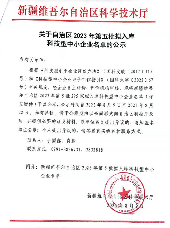 新疆维吾尔自治区2023年第5批拟入库科技型中小企业名单公示正文.jpg PICTURE
