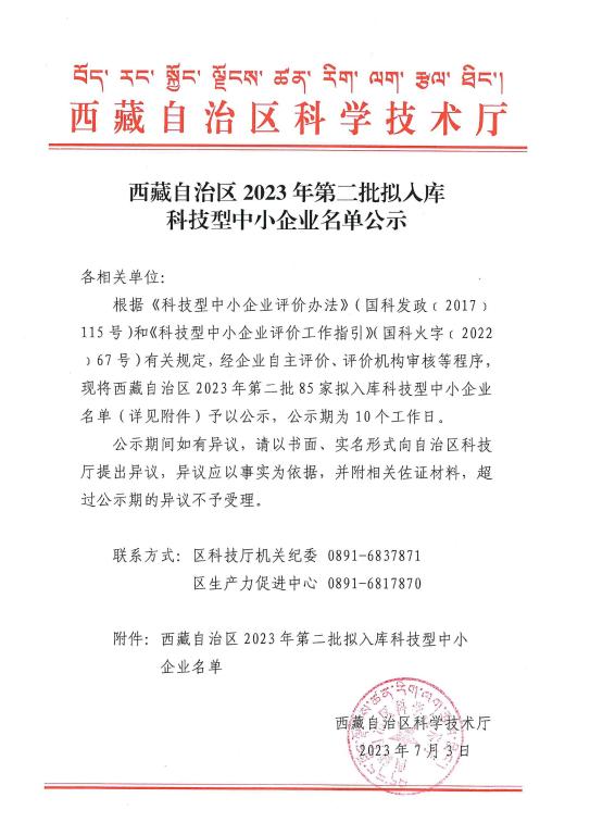 西藏自治区2023年第2批拟入库科技型中小企业名单公示正文.jpg PICTURE