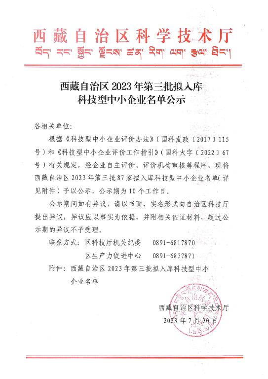 西藏自治区2023年第3批拟入库科技型中小企业名单公示正文.jpg PICTURE