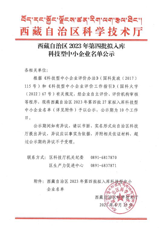 西藏自治区2023年第4批拟入库科技型中小企业名单公示正文.jpg PICTURE