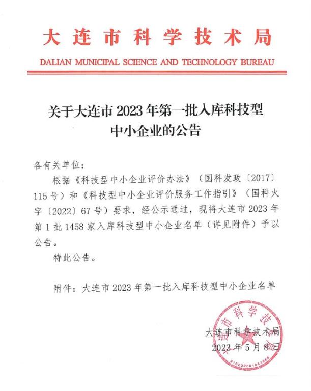 大连市2023年第1批入库科技型中小企业名单公告正文.jpg PICTURE
