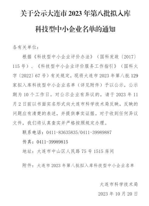 大连市2023年第8批拟入库科技型中小企业名单公示正文.jpg PICTURE