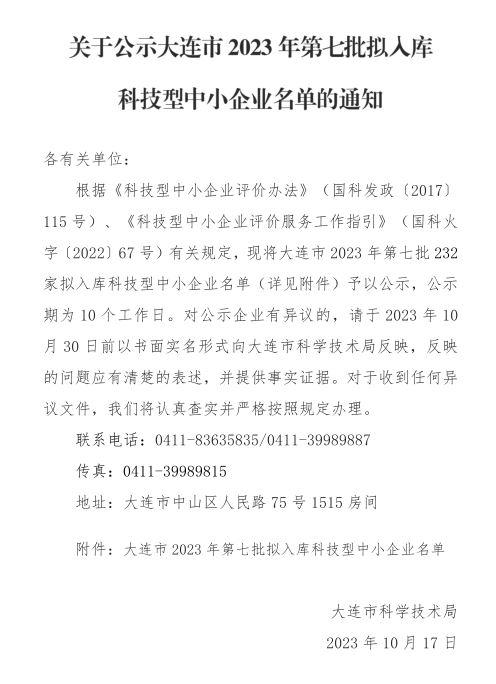 大连市2023年第7批拟入库科技型中小企业名单公示正文.jpg PICTURE