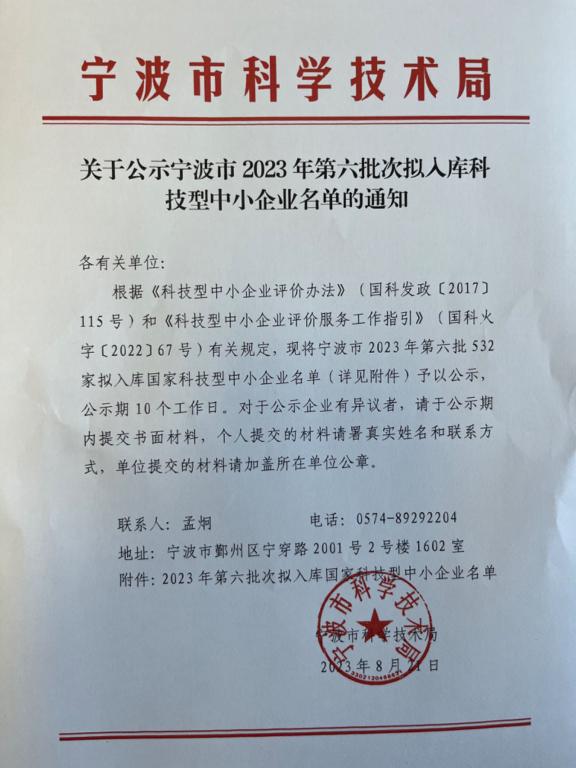 宁波市2023年第6批拟入库科技型中小企业名单公示正文.jpg PICTURE