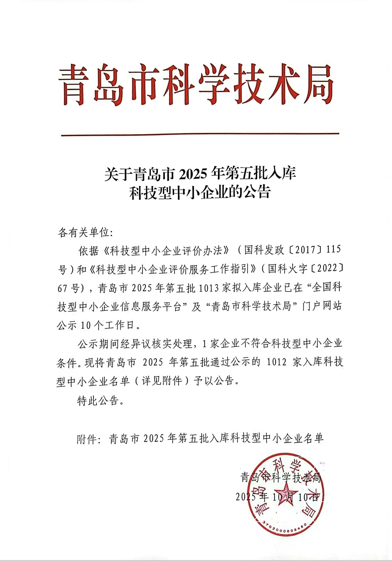 青岛市2025年第5批入库科技型中小企业名单公告正文.jpg PICTURE