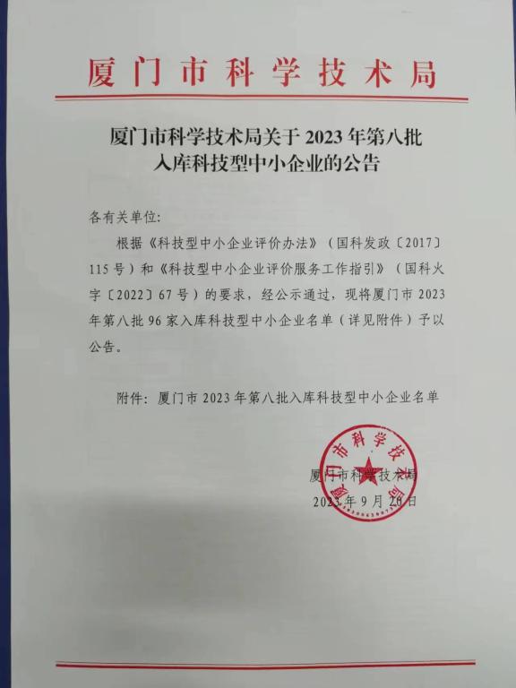 厦门市2023年第8批入库科技型中小企业名单公告正文.jpg PICTURE