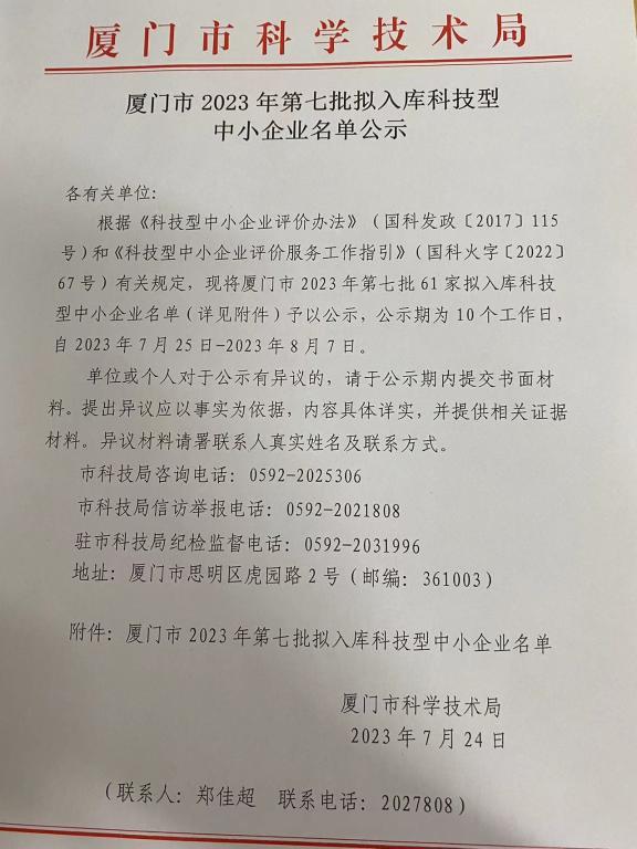 厦门市2023年第7批拟入库科技型中小企业名单公示正文.jpg PICTURE